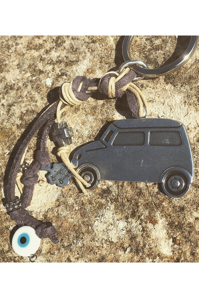 Μπρελόκ με επάργυρο αυτοκίνητο, σταυρό & στοπεράκι, άσπρο ματάκι, σκούρο γκρι suede και ανοικτή μπεζ κεροκλωστή.