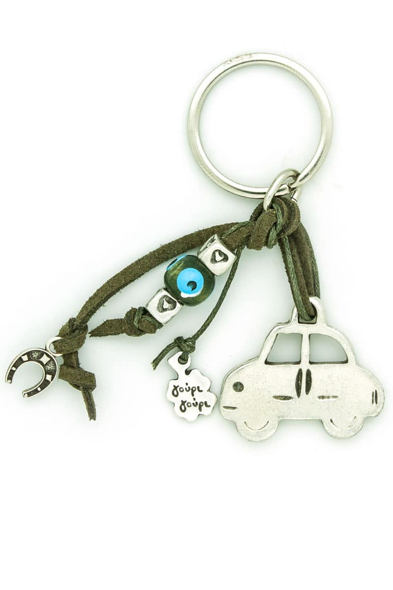 Μπρελόκ με επάργυρο αυτοκίνητο, τετράγωνες χάντρες με καρδιές, πέταλο και πράσινη χάντρα με μάτια σε πράσινο suede και κεροκλωστή.