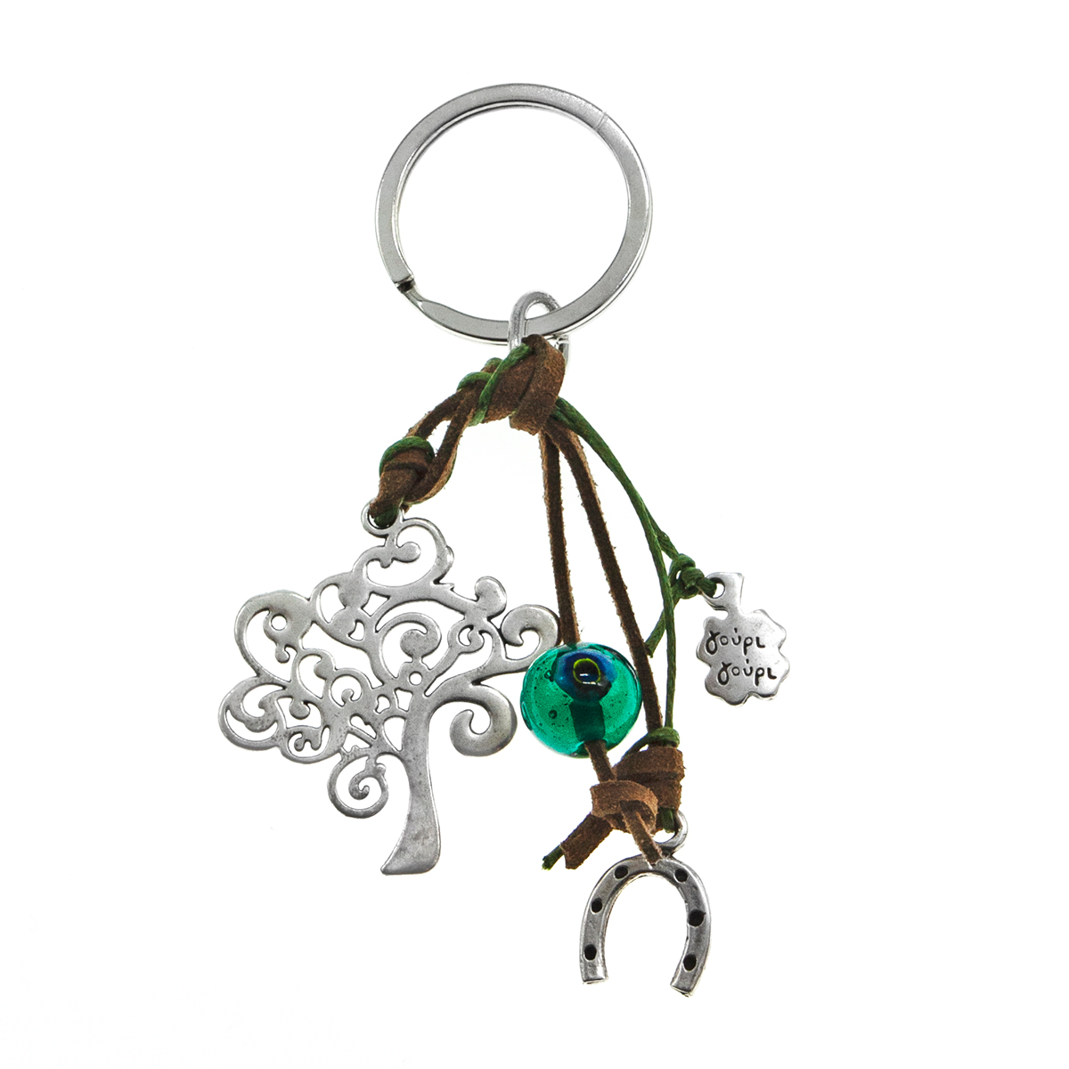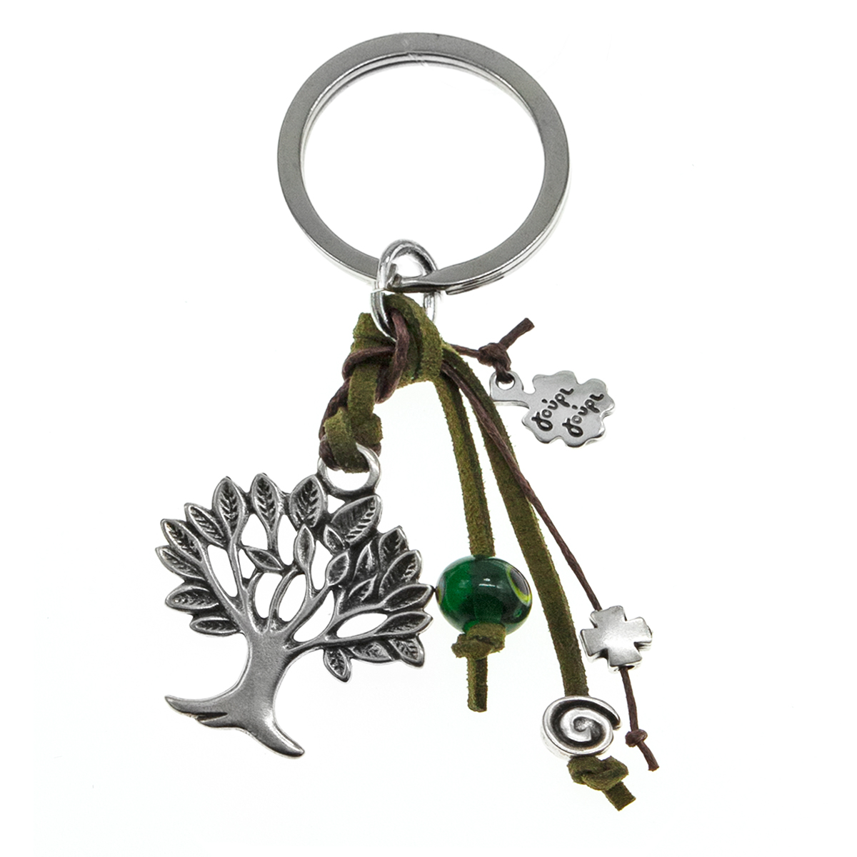 Μπρελόκ με επάργυρο μεταλλικό δέντρο, χάντρα κύβο με καρδιές, σπείρα, σταυρό ή πέταλο. Πράσινο γυάλινο μάτι σε καφέ ή χακί σουέτ κορδόνι και καφέ ή χακί  κηροκλωστή.