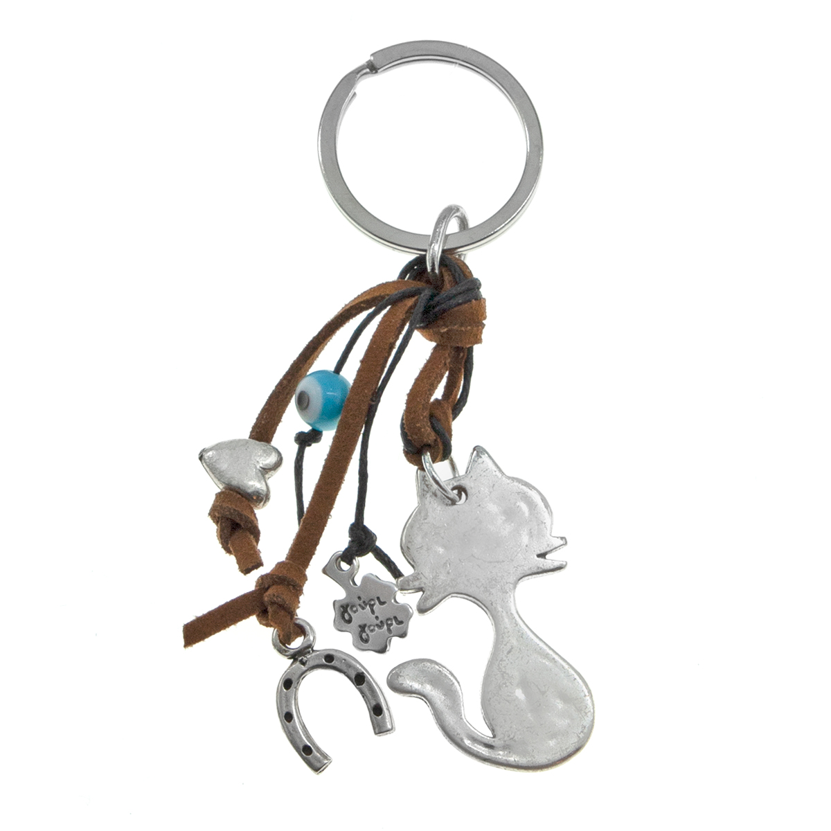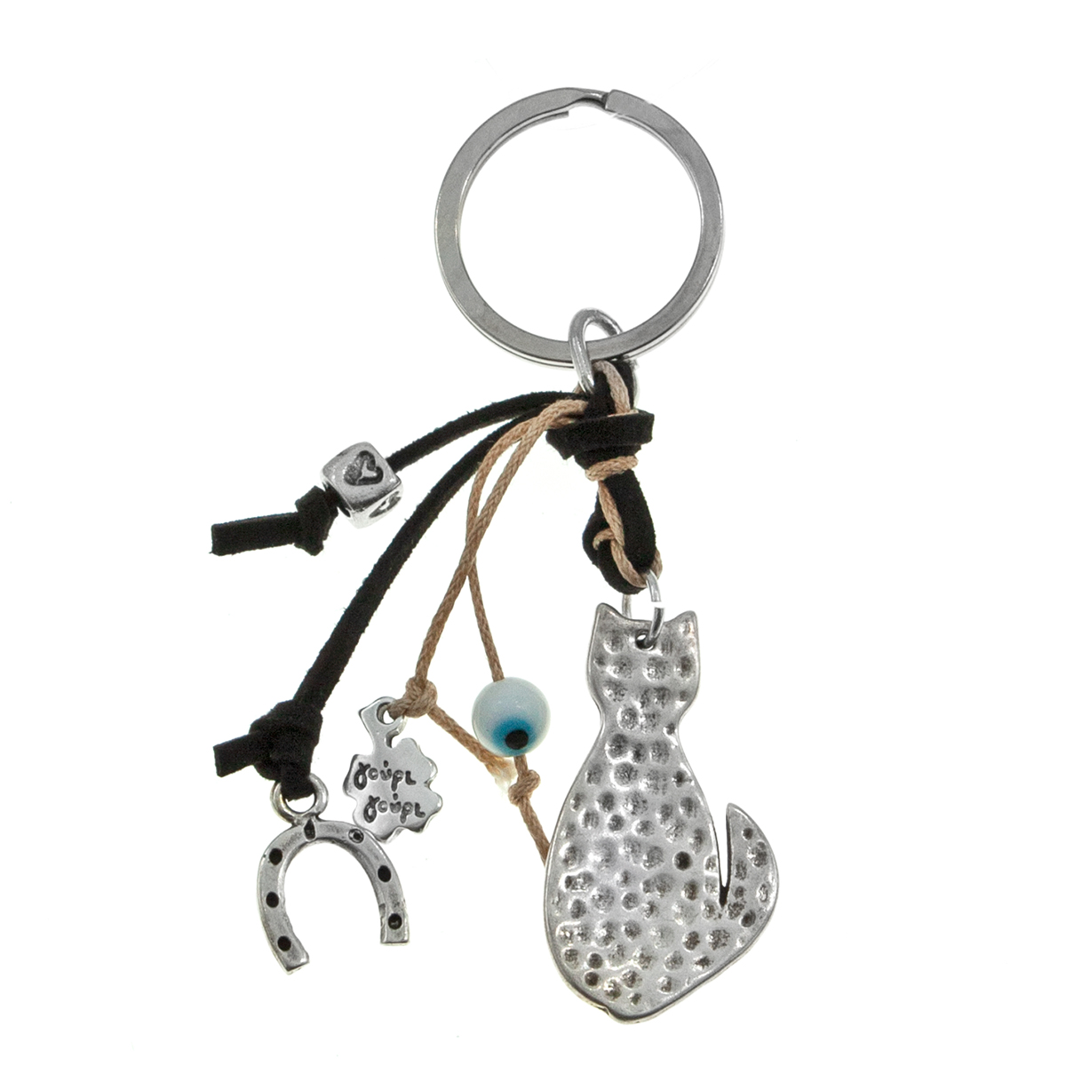 Μπρελόκ με επάργυρη μεταλλική γάτα σφυρήλατη ή λεία, χάντρα κύβος με καρδιές και πέταλο ή καρδιά και πέταλο. Λευκό ή γαλάζιο γυάλινο μάτι σε μαύρο ή καφέ σουέτ κορδόνι και μαύρη ή μπεζ κηροκλωστή.