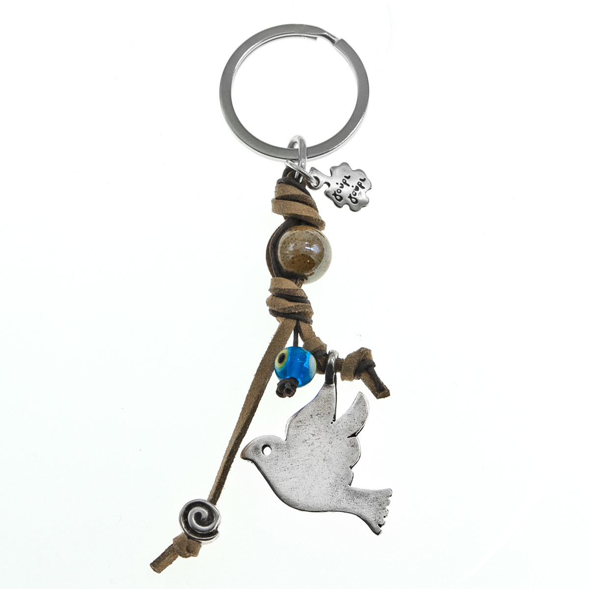 Μπρελόκ με επάργυρο μεταλλικό πουλί και χάντρα σπέιρα. Κεραμική μπεζ στρογγυλή χάντρα, γαλάζιο γυάλινο μάτι σε μπεζ σουέτ κορδόνι και καφέ κηροκλωστή.