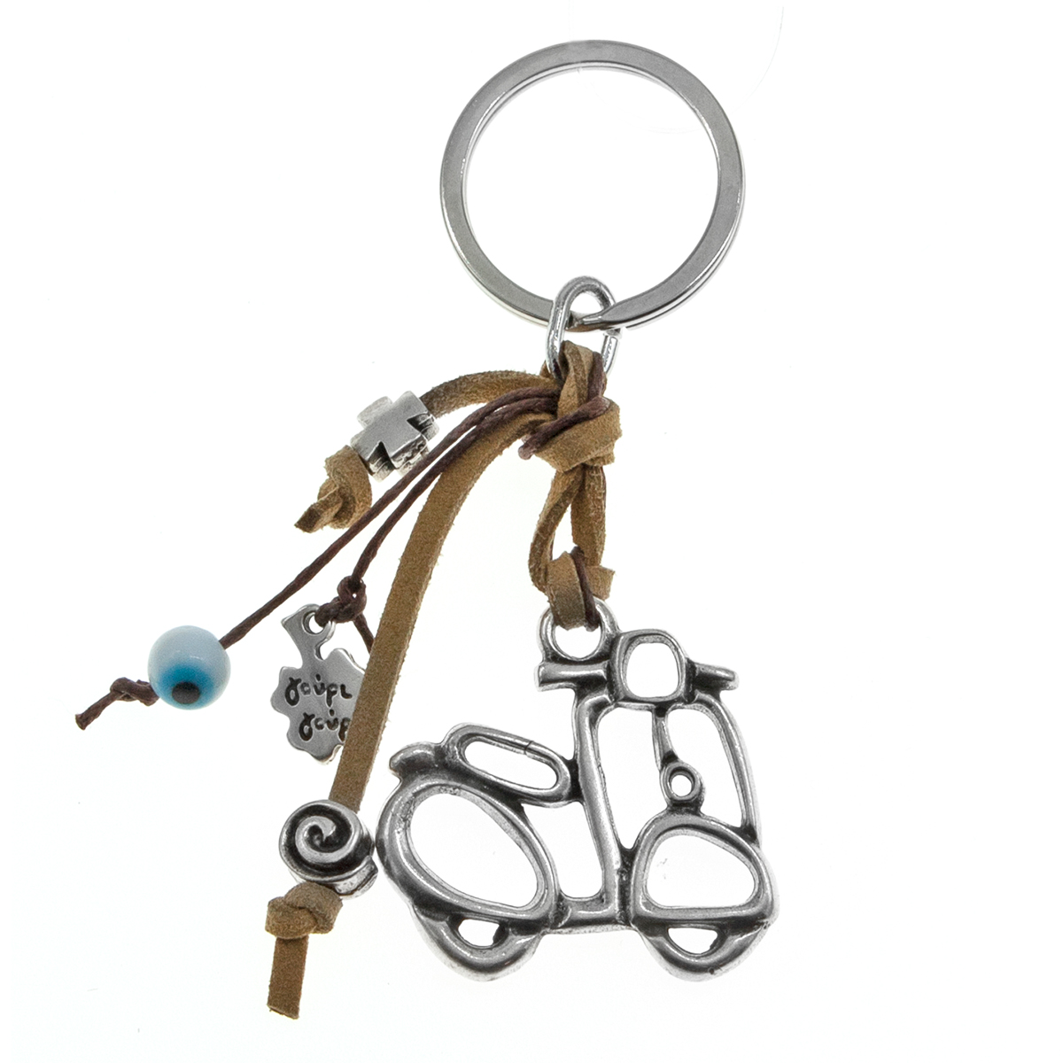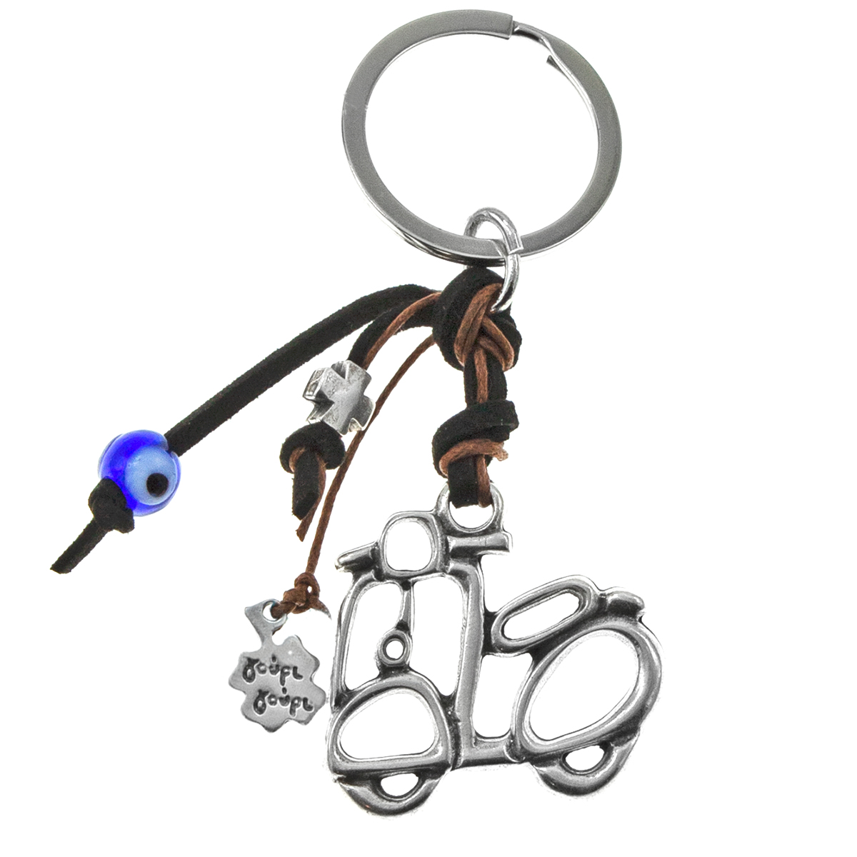 Μπρελόκ μοτοσυκλέτας με επάργυρη μεταλλική μοτοσυκλέτα και χάντρα σταυρός. Μπλε ή λευκό γυάλινο μάτι σε μπεζ ή μαύρο σουέτ κορδόνι και καφέ κηροκλωστή.