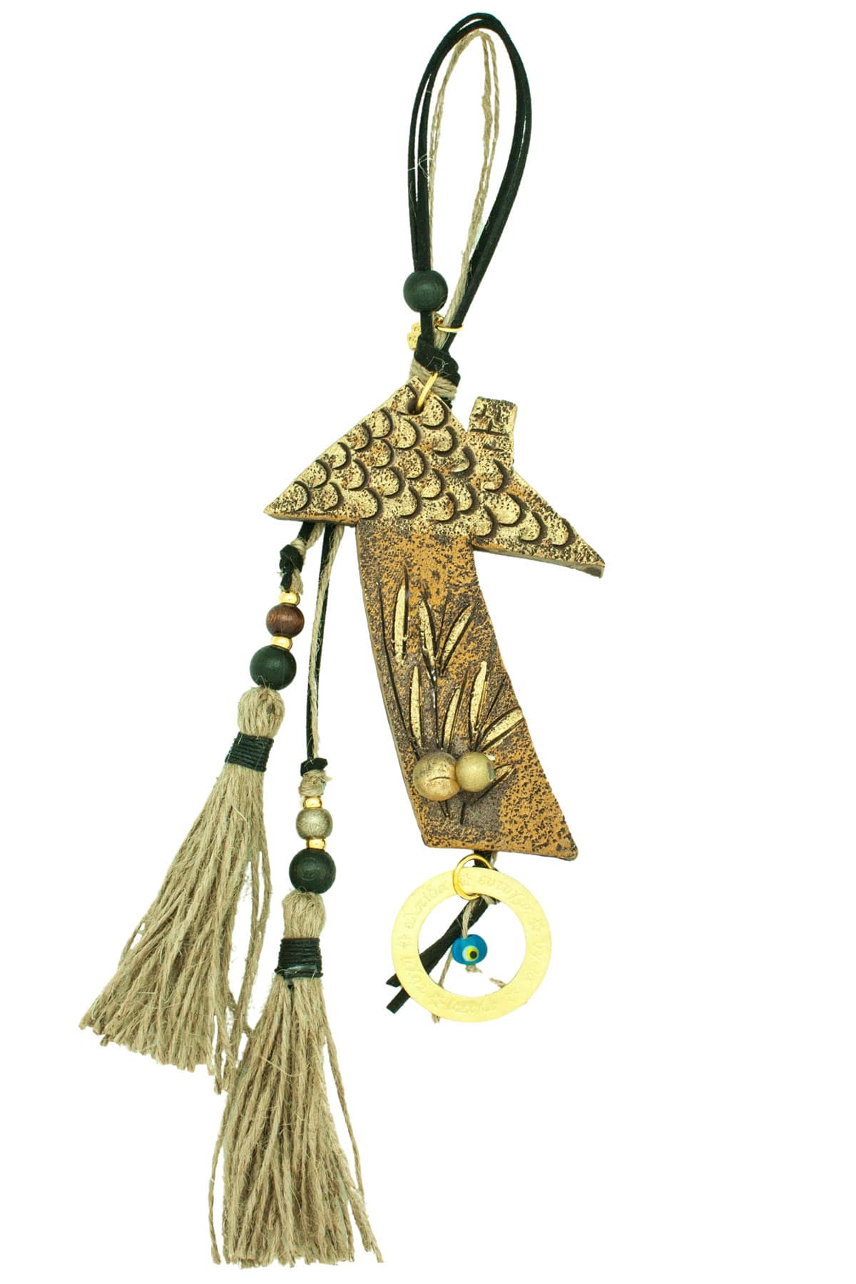 Ένα διακοσμητικό δώρο με μεγάλο κεραμικό σπίτι, επίχρυσο 24Κ κρίκο ευχή για υγεία, αγάπη, τύχη, ελπίδα & ευτυχία, μικρό μπλε μάτι, ξύλινες χάντρες, καφέ φυσικό σκοινί και μαύρο suede.