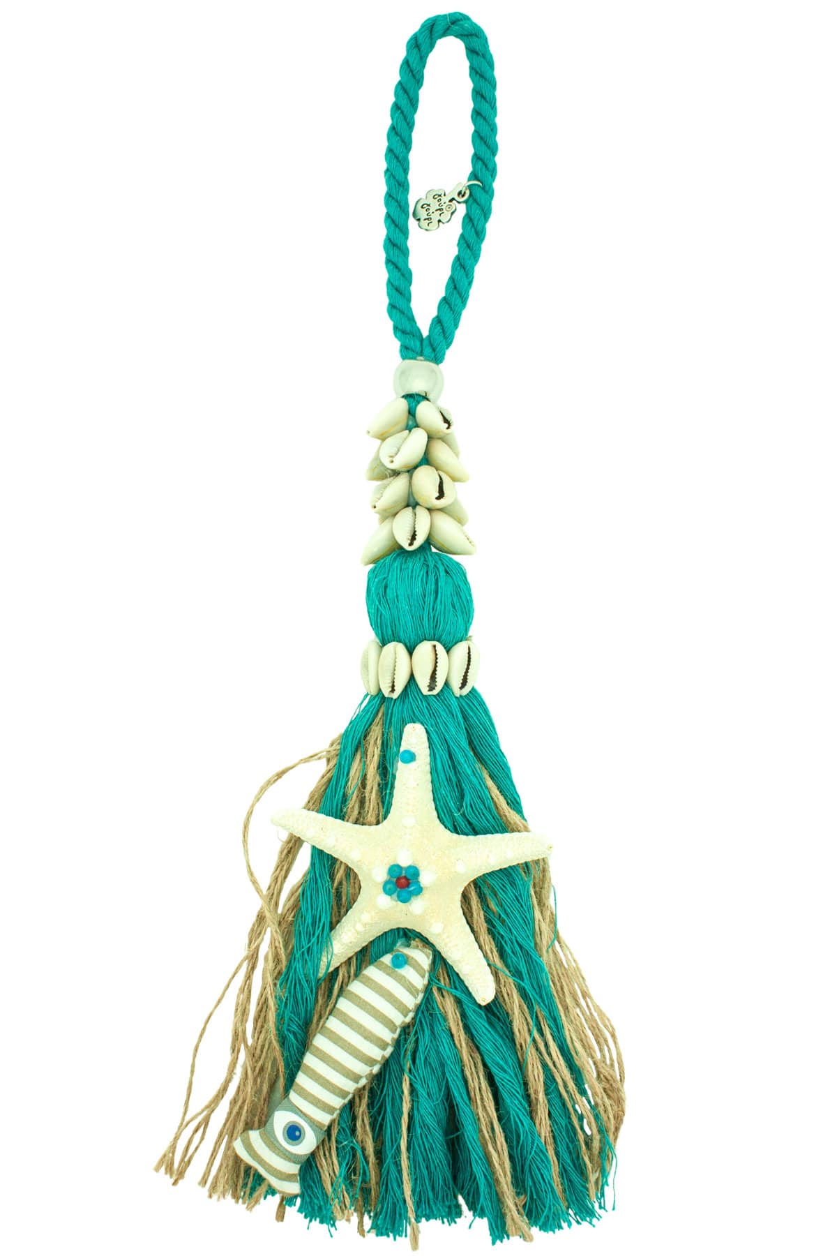 Διακοσμητικό γούρι για το καλοκαίρι με μεγάλο αστερία, υφασμάτινο ψάρι και κοχύλια σε θηλιά από χοντρό μπλε κορδόνι.