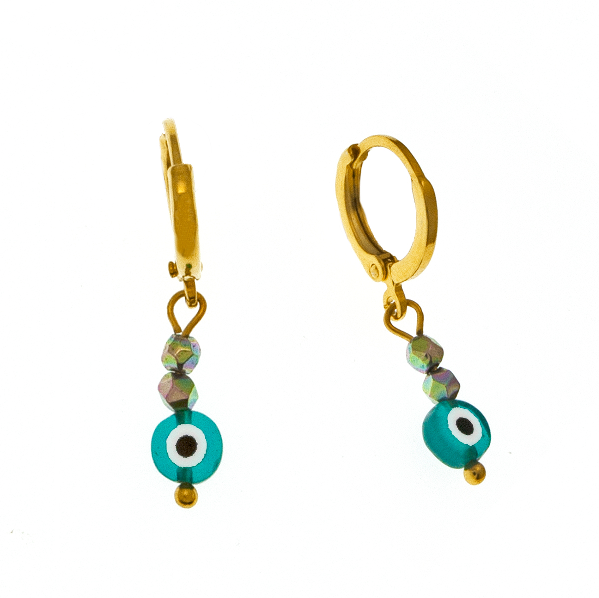 Σκουλαρίκια επίχρυσα μεταλλικοί κρίκοι με κρεμαστό πράσινο γυάλινο ματάκι και ιριζέ στρογγυλές ταγιέ χάντρες αιματίτη. (Για τρυπημένα αυτιά.)