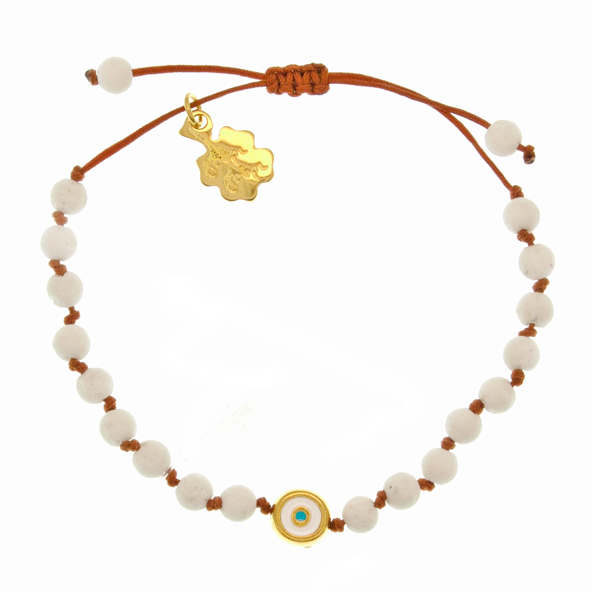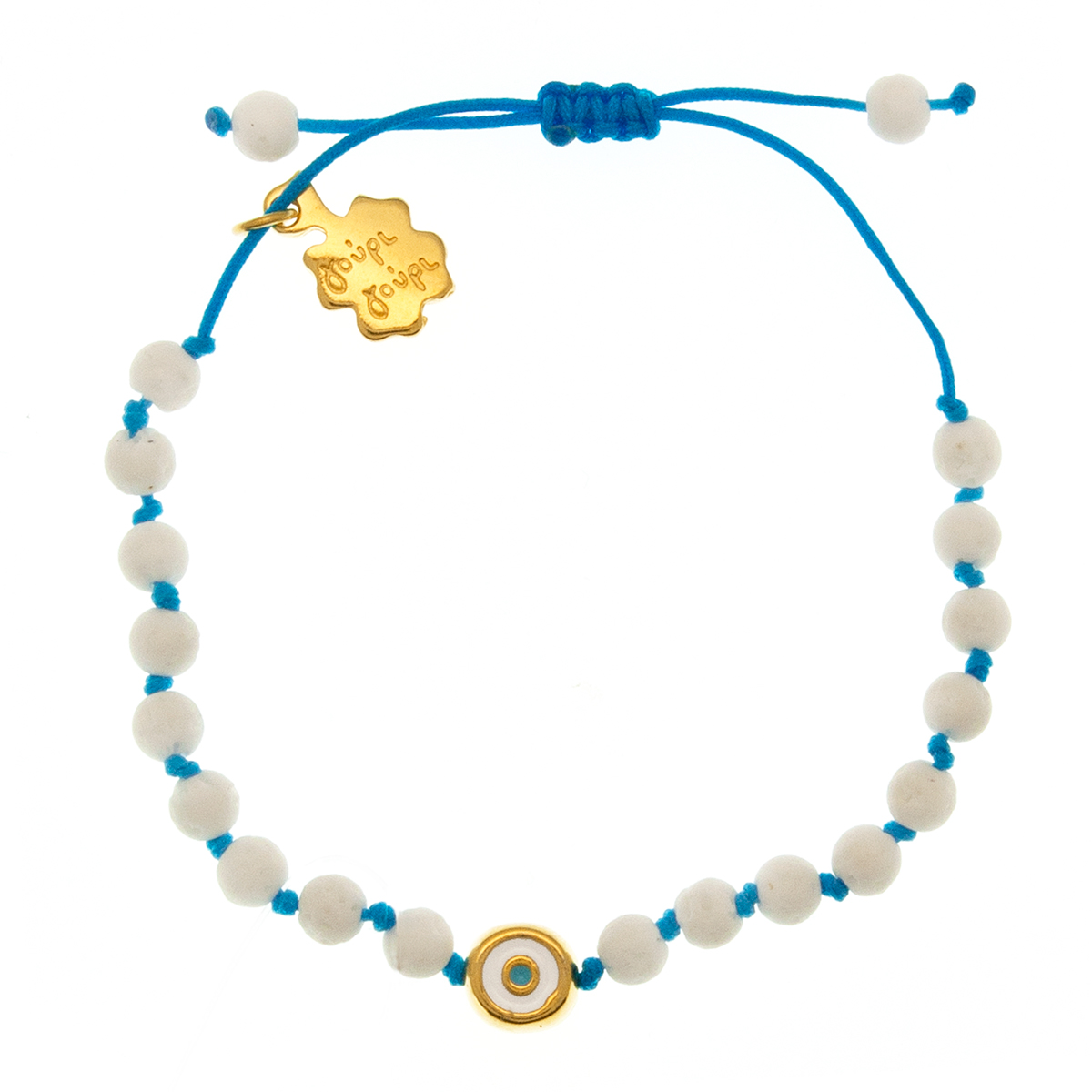 Ένα βραχιόλι με επίχρυσο 24K μεταλλικό μάτι με λευκό σμάλτο και λευκές στρογγυλές χάντρες λάβα, σε γαλάζιο ή μπεζ κορδόνι.
