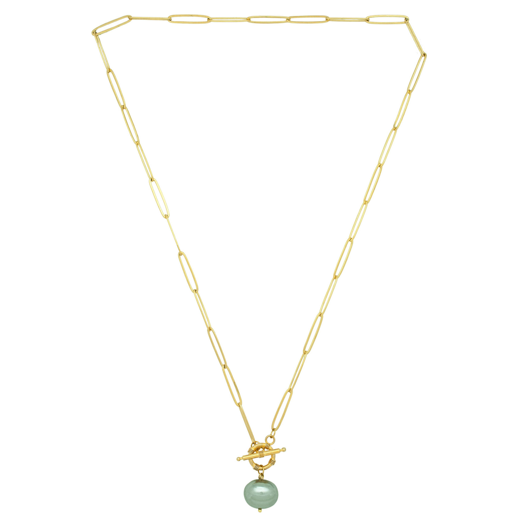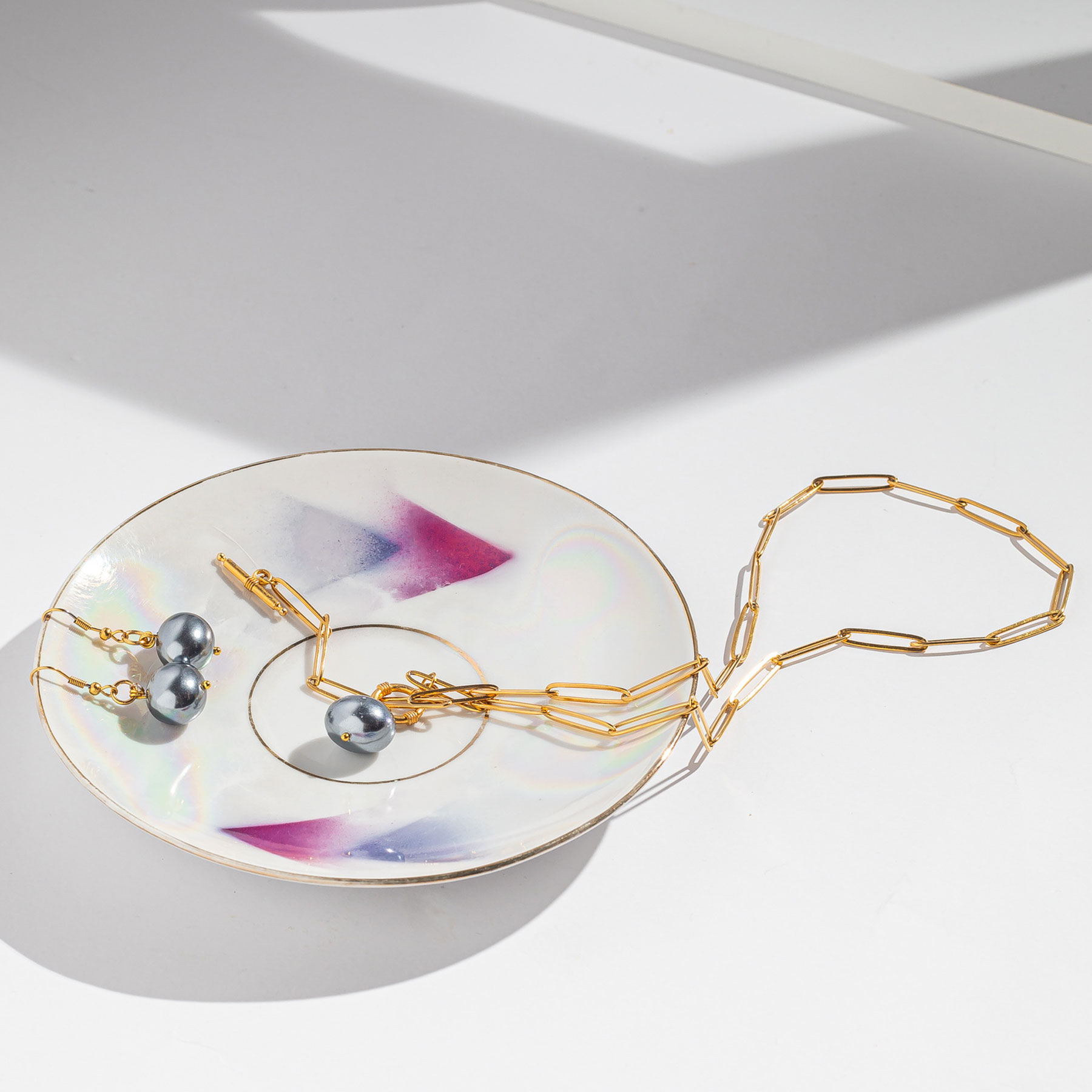 Ένα κολιέ με μεγάλο γκρι μαργαριτάρι σε επίχρυση ατσάλινη αλυσίδα.