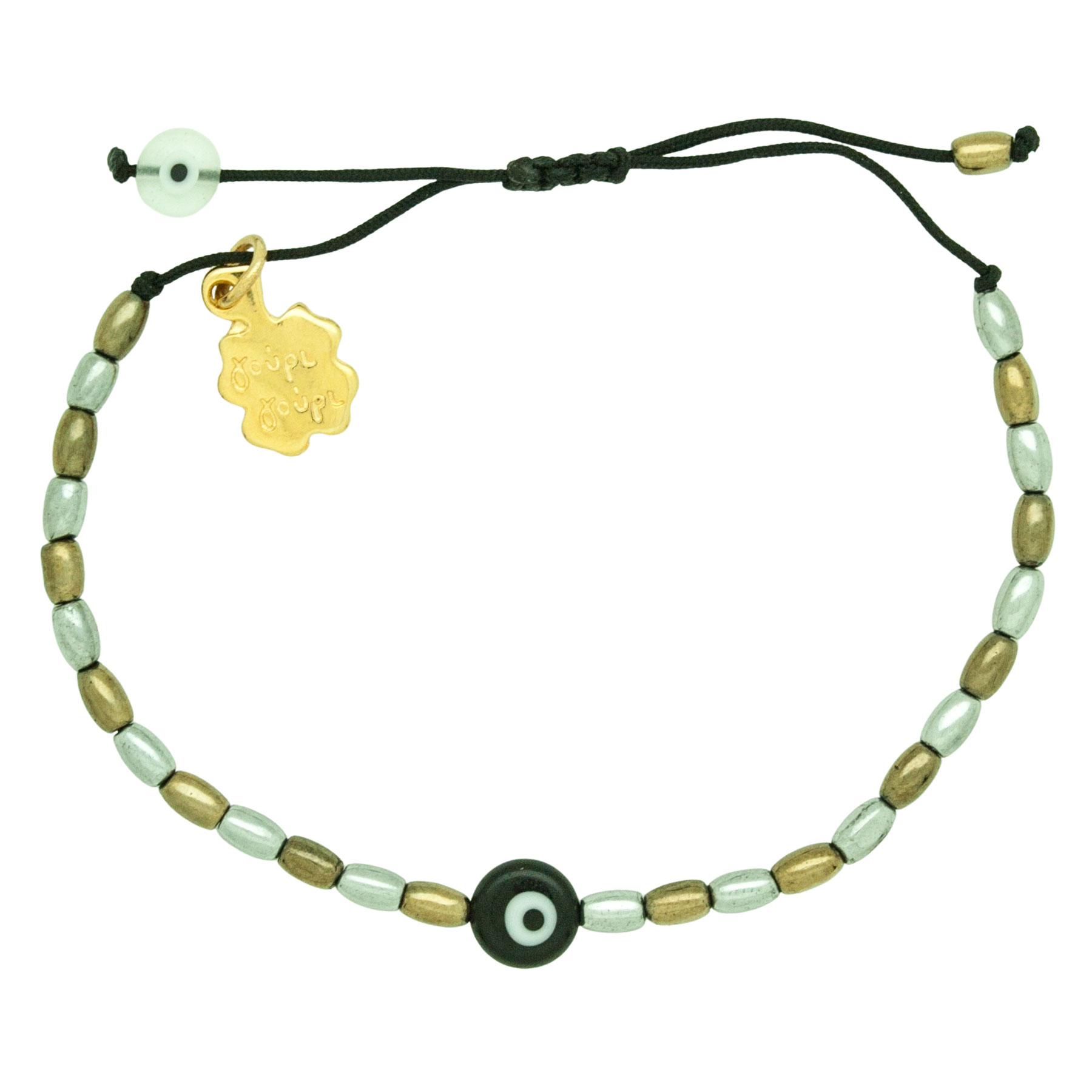 A bracelet for any occasion with silver & pyrite colour hematite beads on black thread.