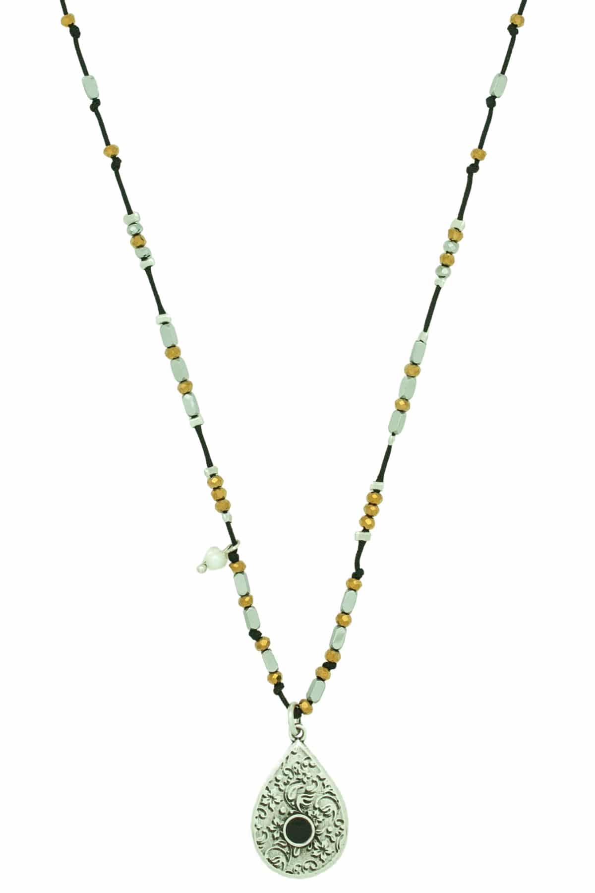A necklace with silver-plated, drop-shaped pendant with pattern, silver & golden hematite beads and small pearl on black string.