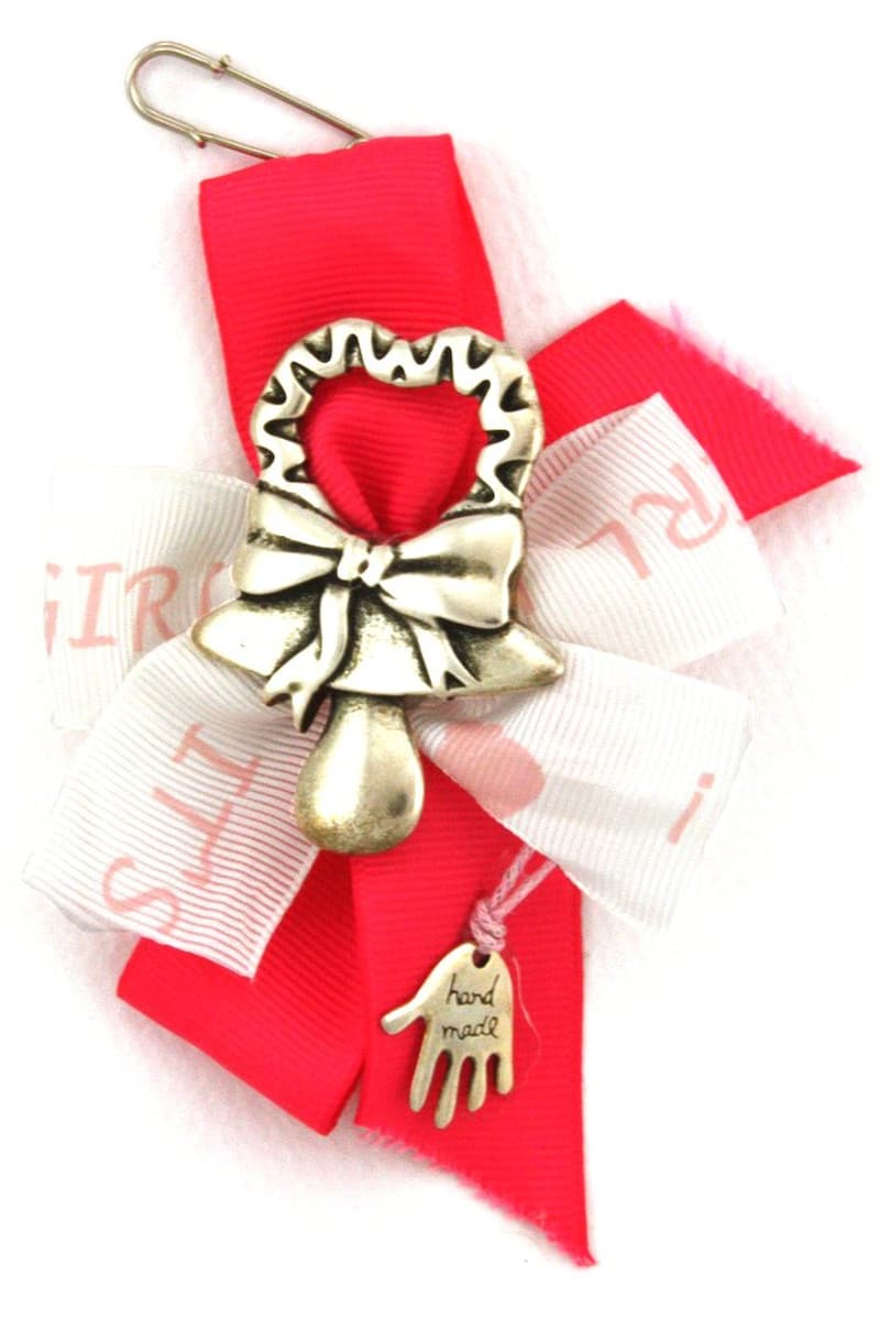 A baby charm for good luck charm for new baby girls with large silver-plated soother on pink “it’s a girl” & fuchsia ribbons with small pin.