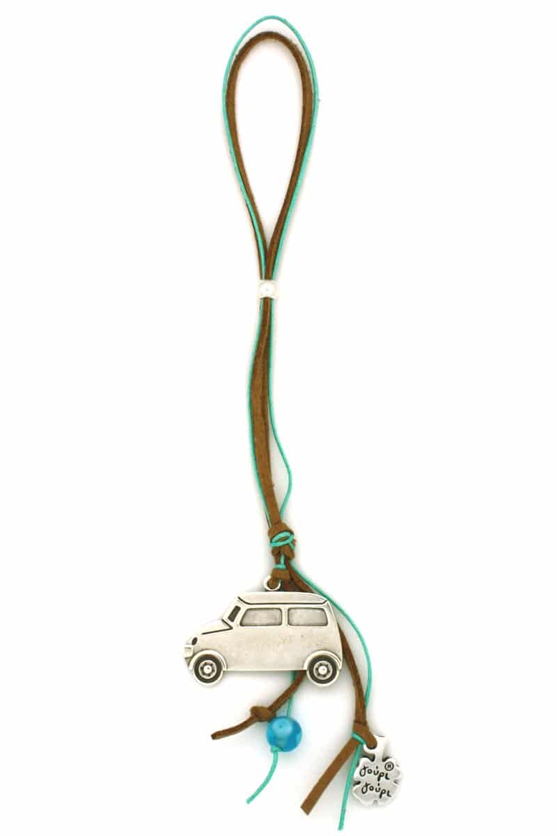 A car rearview mirror charm with large silver-plated car & length adjustment bead and turquoise evil eye bead on brown suede with turquoise waxed string.   Length (adjustable): 14-28 cm / 6-11 in.   Symbols:  Evil eye.