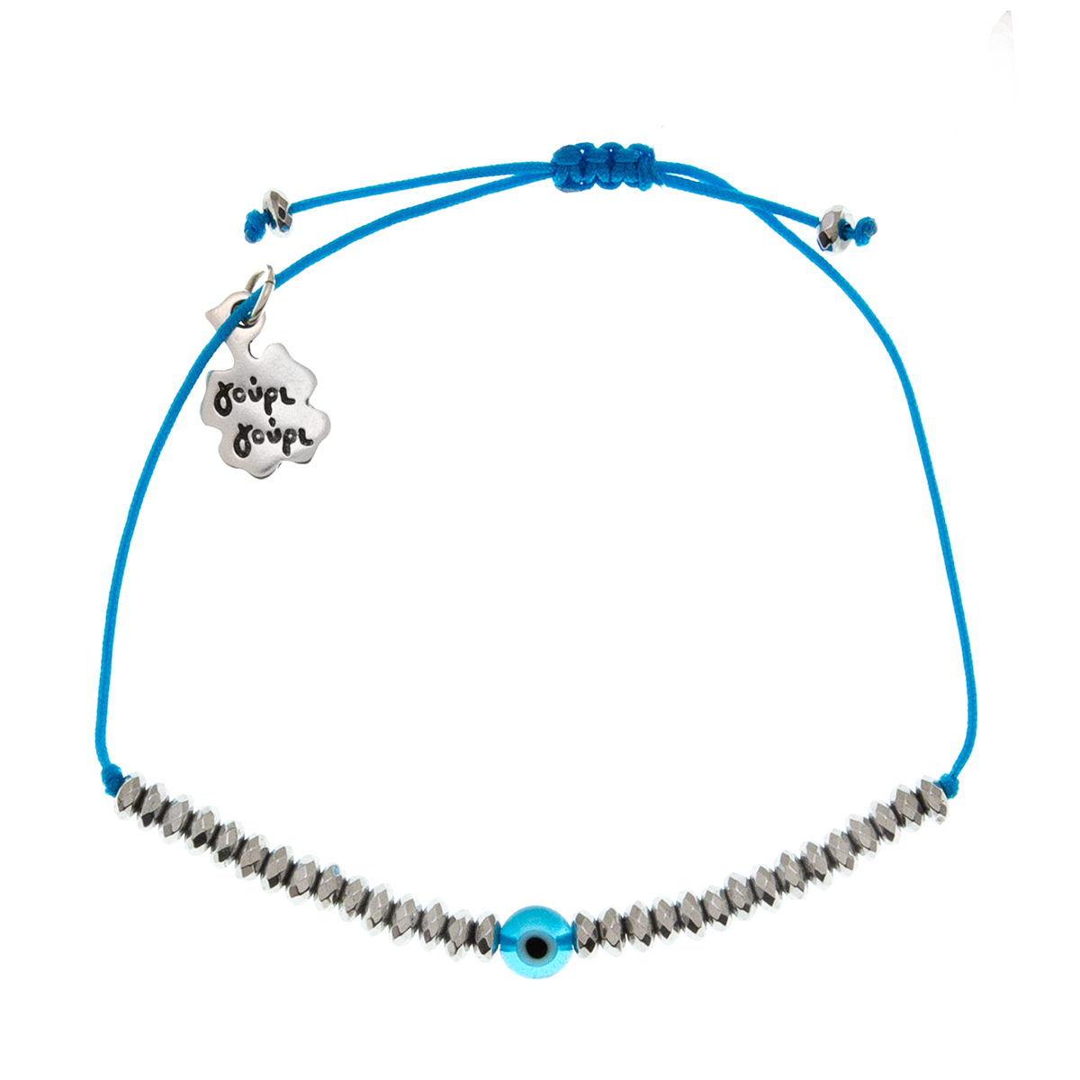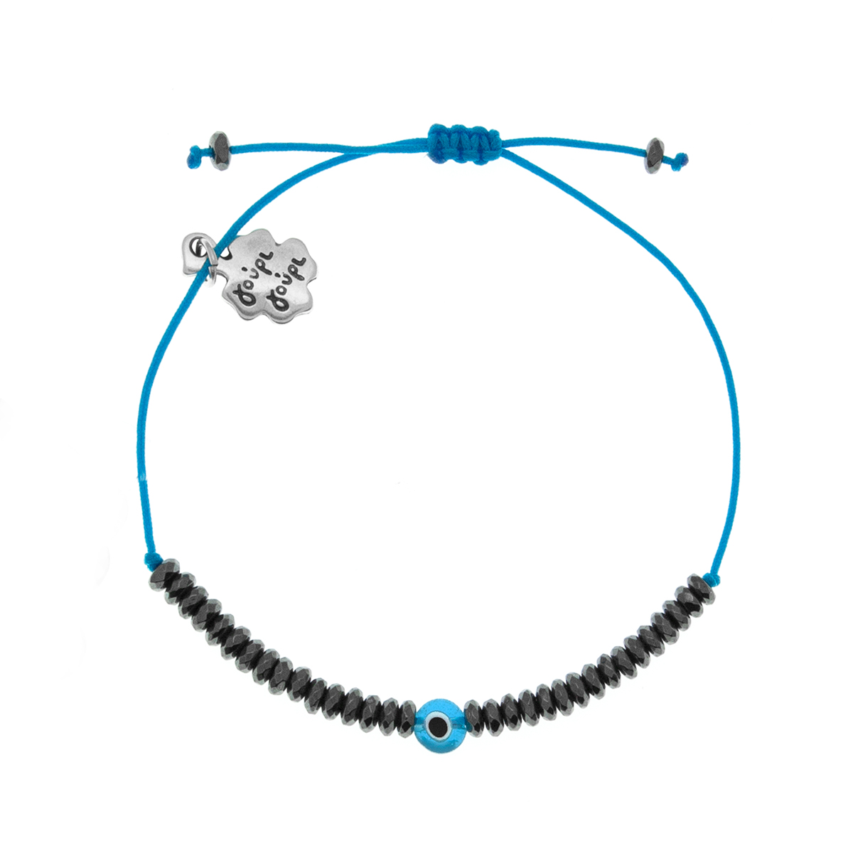 A bracelet with light blue glass evil eye and black or gold or silver faceted hematite rondelle beads on light blue cord.