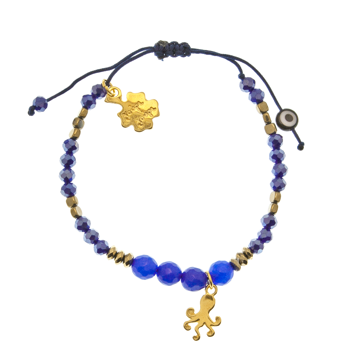 A bracelet with gold-plated 24Κ metallic octopus, blue jade round faceted semi-precious stones, blue round faceted crystal beads, square and rondelle gold hematite beads and black glass evil eye.