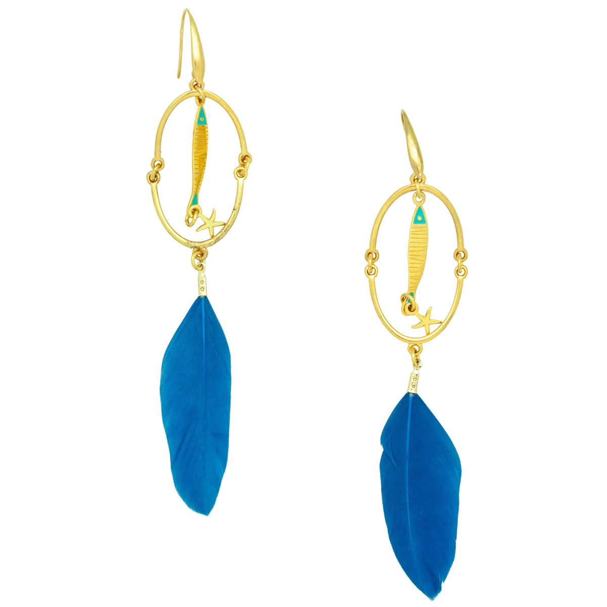 Gold-plated earrings with fish, small star and blue feather. (For pierced ears.)