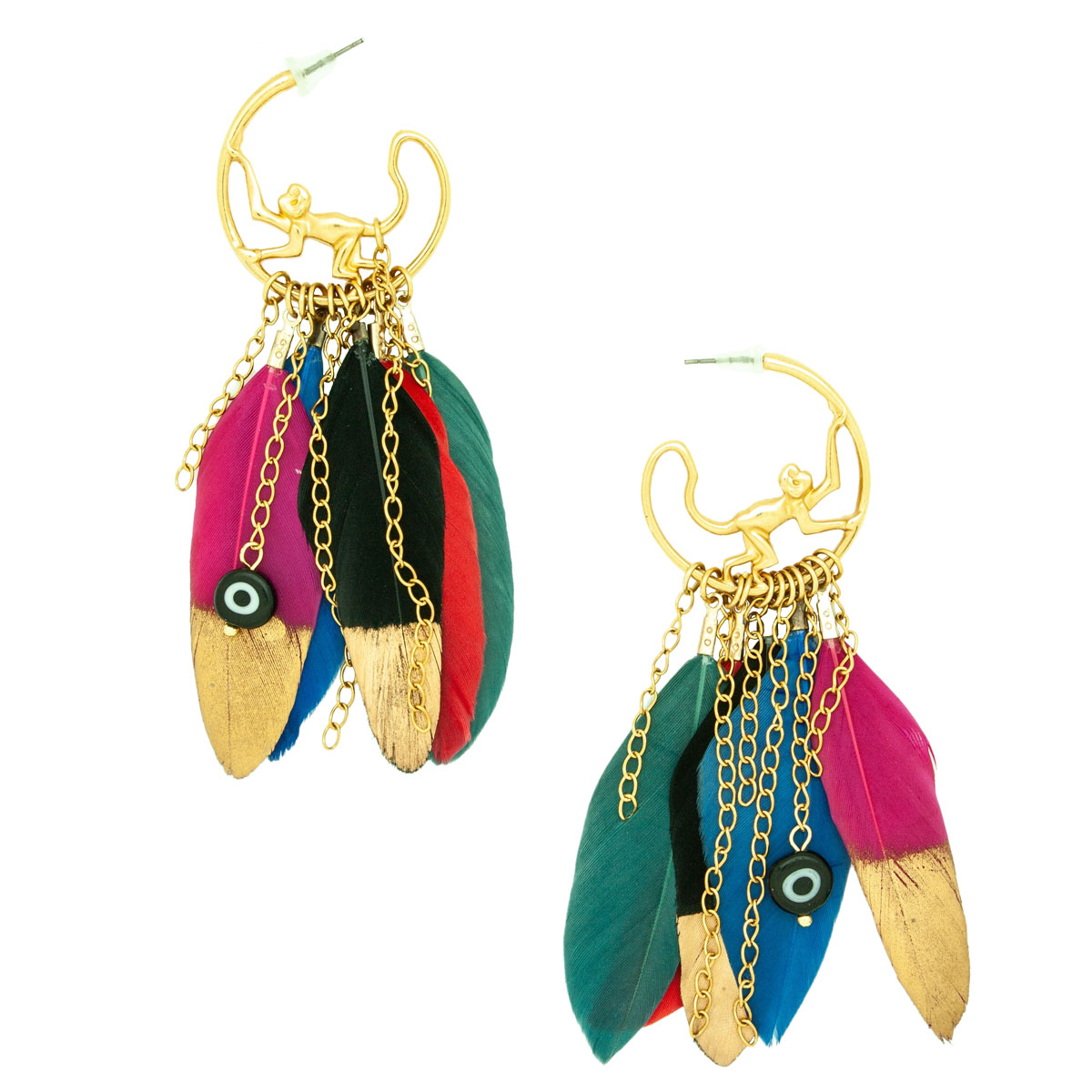 Gold-plated rings with monkey, small black evil eye and multiple chains & feathers. (For pierced ears.)