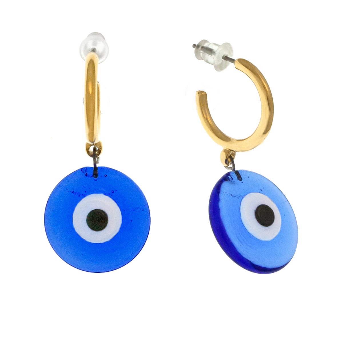 Metallic hoop gold-plated earrings with hanging round-flat blue glass evil eye. (For pierced ears.)